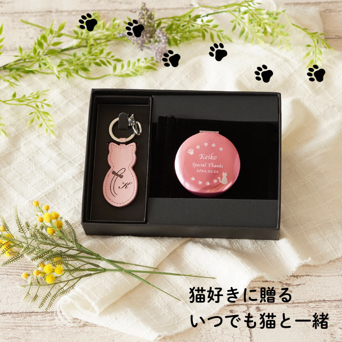 商品情報 【 革製猫キーホルダー&コンパクトミラーセット 】 猫が好きなあの人へ!キーホルダーとミラーの可愛さ溢れるギフトセットです。