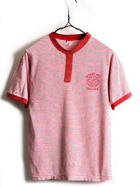 裾はシングルステッチのビンテージボディ ホワイト x レッド の好配色、2トーン ボーダー なかなか見かけないチョコチンタイプのボーダー 左胸に雰囲気の良い染み込みカレッジプリント入り シンプルなデザインで合わせやすく 1枚で様になる商品です。