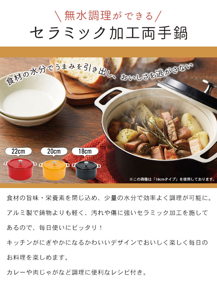 商品情報食材の水分でうまみを引き出し、美味しさを逃さない、無水調理ができるセラミック加工両手鍋。